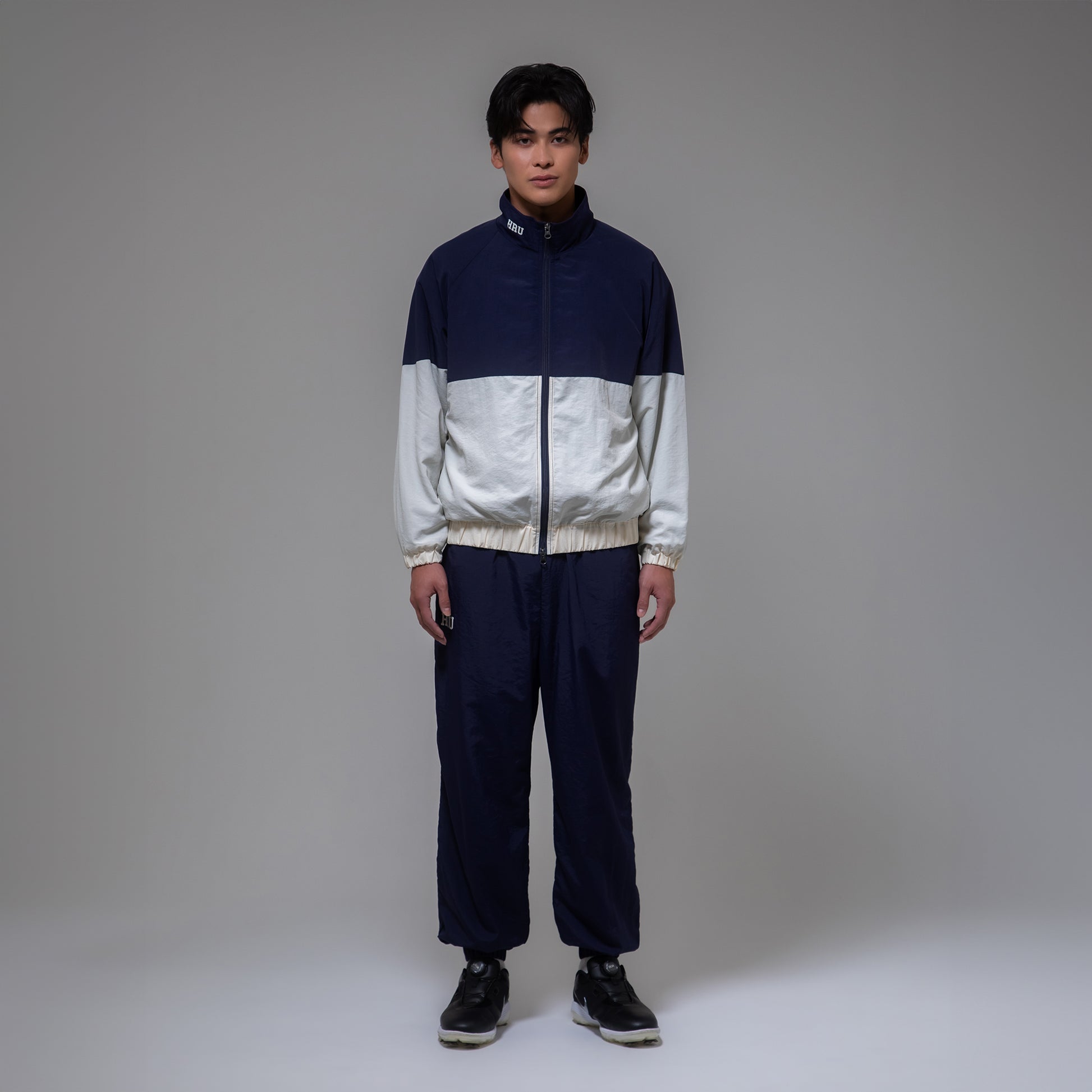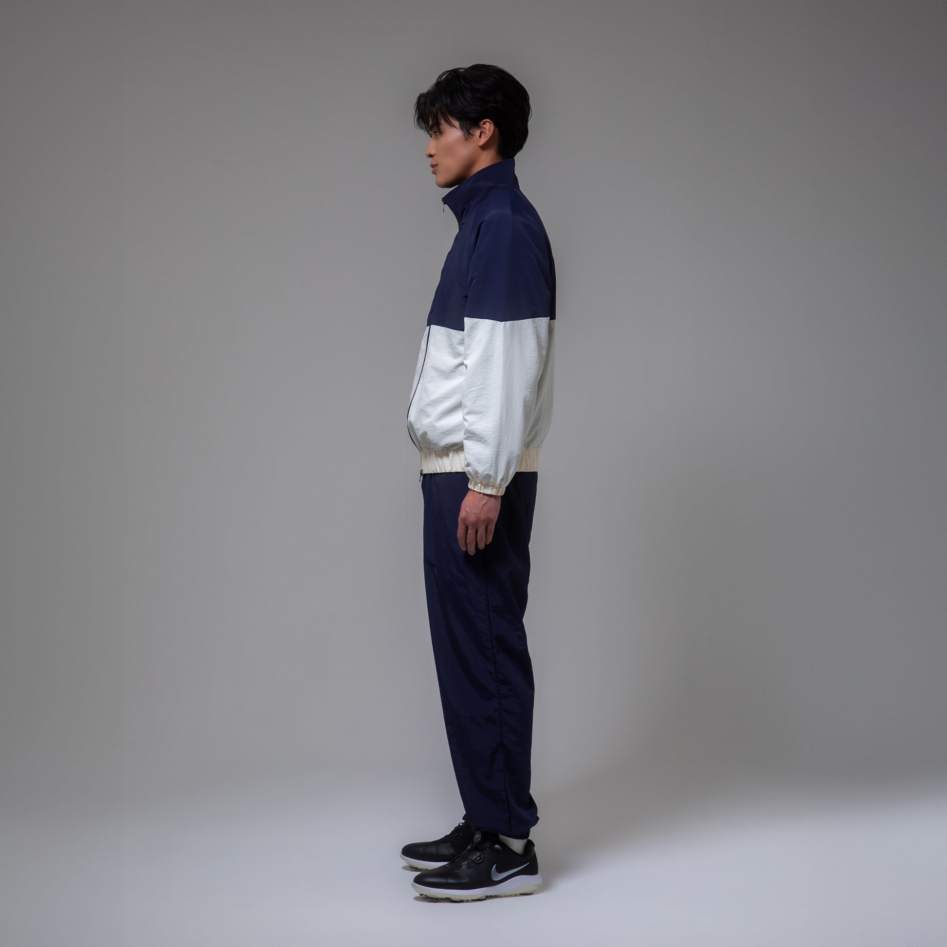 センターラインで切り替えた大胆な配色が印象的なナイロントラックジャケット。